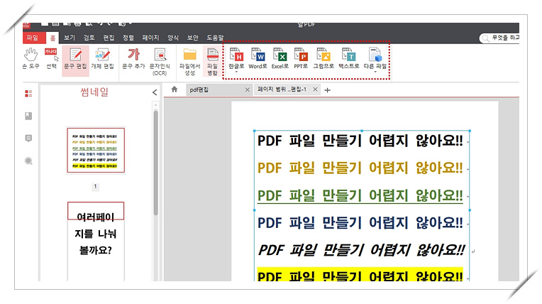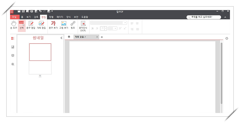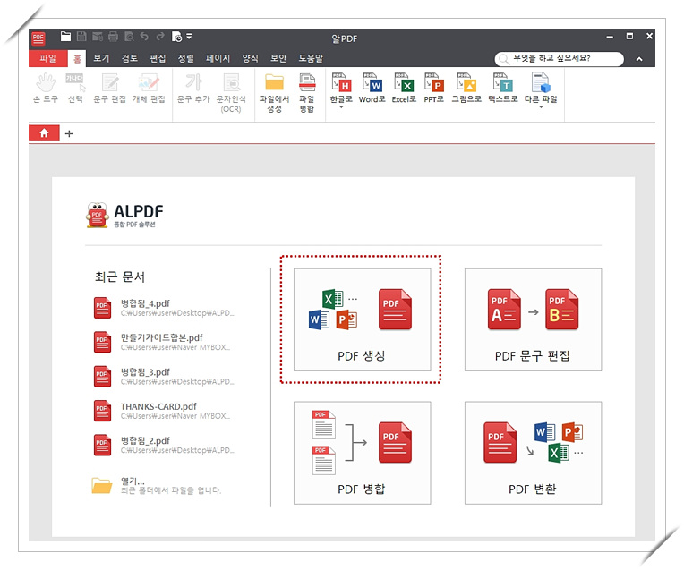 이 기능역시 알PDF의 초기화면에서 선택할 수 있습니다. 혹은 변환할 PDF문서를 열어 홈 메뉴에서 실행하면 됩니다.