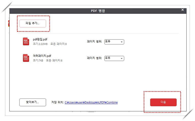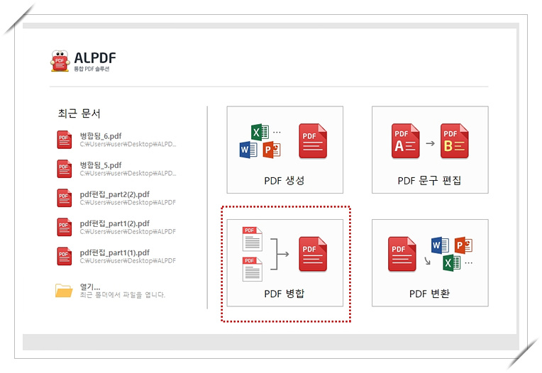 아래 처럼 알PDF의 초기화면에서 PDF 병합을 눌러 합치기 원하는 파일을 한꺼번에 지정하여 불러들인 후 새로운 PDF로 저장해 주기만 하면 됩니다.