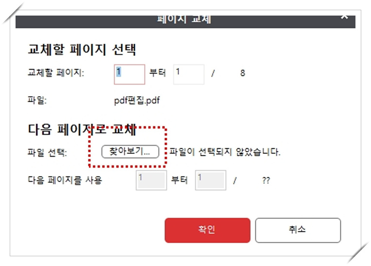 교체: 특정페이지의 내용을 다른 PDF 문서로 교체할 수 있습니다.