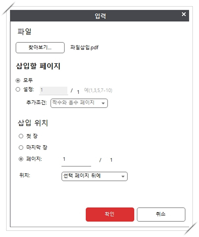 삽입할 파일의 위치와 페이지를 설정하고 확인 버튼을 눌러 삽입합니다.