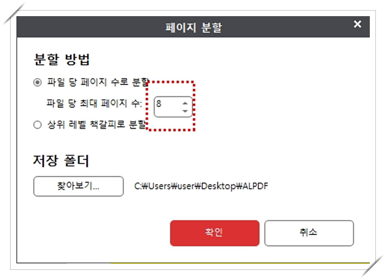 분할된 파일을 몇개의 페이지로 생성할 것인지 설정값을 주고 확인을 눌러줍니다.