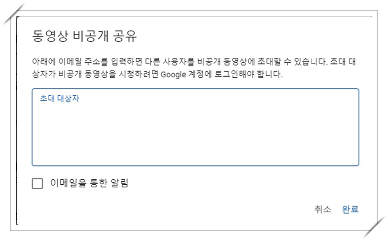 게시자가 파란 박스 안에 초대 대상자의 메일 주소를 입력해놓아야만 영상의 시청이 가능합니다.