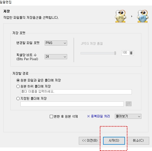 원하는 항목의 체크박스를 선택하시고 다음버튼을 눌러 설정값을 넣어주고 시작 버튼을 누르면 편집이 완료됩니다.