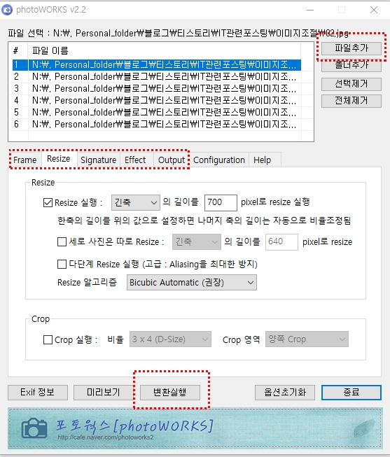 포토웍스는 사진 자체에 필터나 꾸밈 효과를 주기보다는 일관된 사이즈와 프레임을 넣은 이미지로 변환할 때 매우 편리합니다.