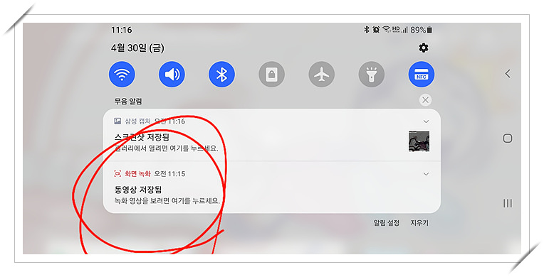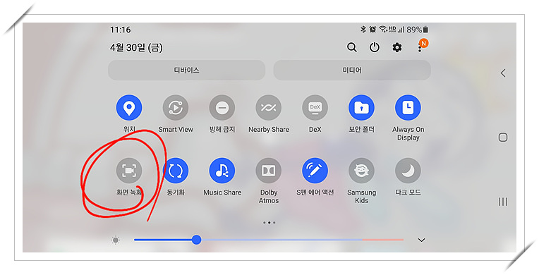 2. 화면 상단을 끌어내려 설정창을 띄우고 화면녹화 아이콘을 찾아 누릅니다.