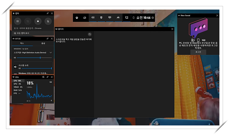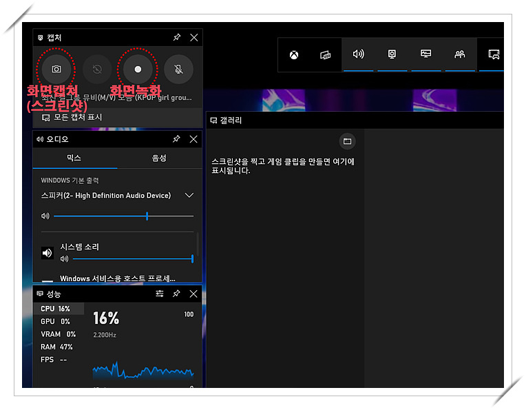 2. 윈도우즈키+G를 누릅니다. (윈도우즈 키는 윈도우즈 마크가 그려진 키입니다.)