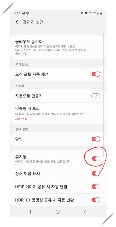 만일 휴지통 기능을 사용하고 싶지 않을 경우는 겔러리와 내파일의 설정창에서 휴지통 기능을 OFF하는 것도 가능합니다.