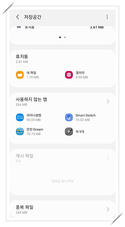 계속 스크롤을 내려주면 아래와 같이 휴지통, 중복파일, 사용하지 않는 앱 등 불필요한 데이타를 선택하여 삭제가 가능합니다.