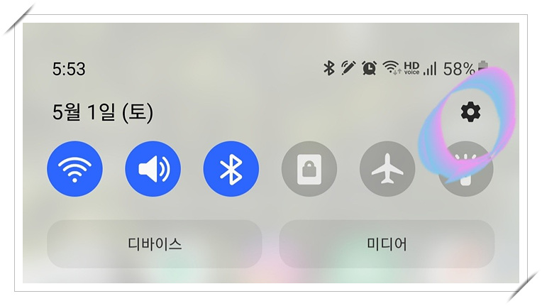 휴대폰의 상단을 끌어내려 설정버튼을 눌러줍니다.