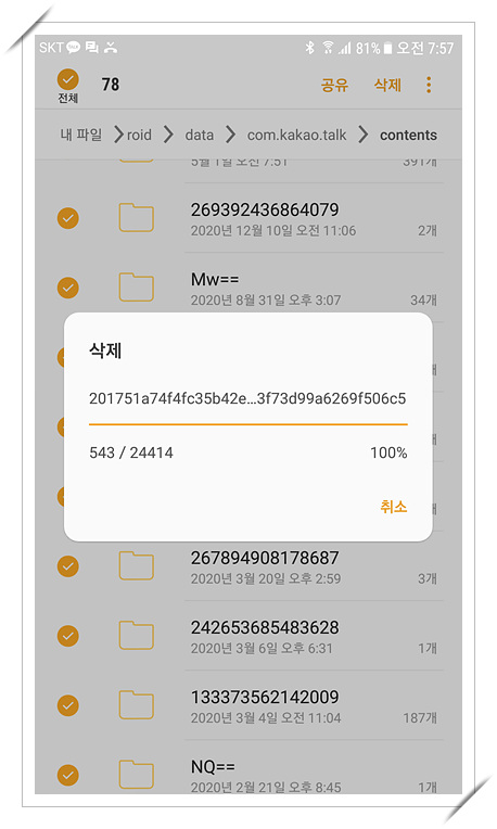 내파일 > Android > data > com.kakao.talk > Content 파일의 하위 폴더를 모두 삭제