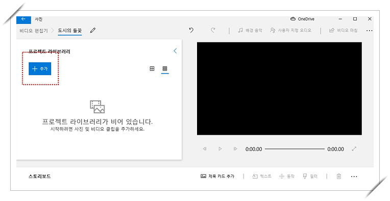 3. 추가버튼을 눌러 원하는 사진들을 선택하여 모아놓은후 스토리보드에 놓기로 선택합니다.
