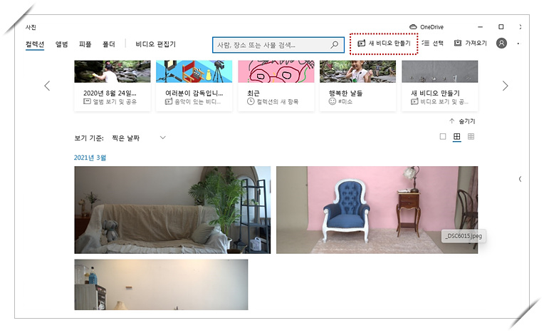 사진 동영상 만들기는 별도의 프로그램이나 어플 설치없이 기본적으로 PC에서는 사진 프로그램으로, 휴대폰에서는 겔러리에서 바로 쉽게 만들 수 있습니다.